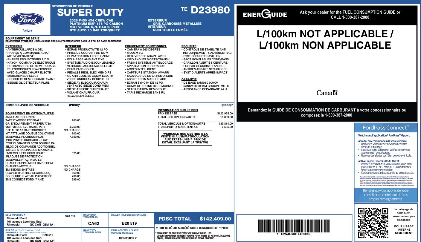 Détails du prix SUPER DUTY F-450 DRW PLATINUM CABINE 6 PLACES 4RM CAISSE DE 8 PI 2026 #26060