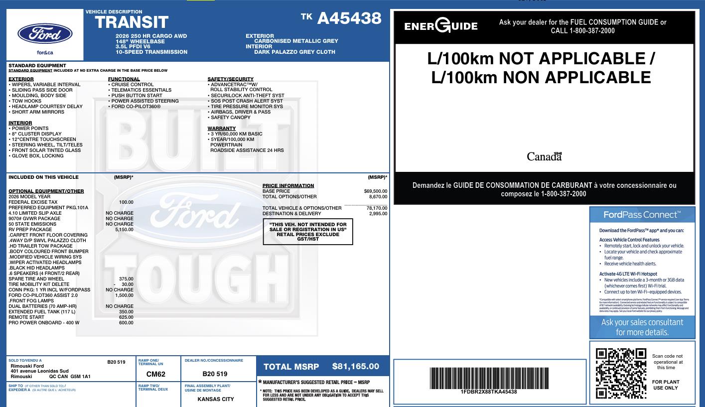 Détails du prix TRANSIT FOURGON UTILITAIRE T-250 TI TOIT SURÉLEVÉ 148 PO PNBV DE 9 070 LB 2026 #26070