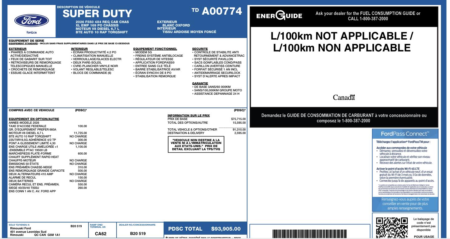Détails du prix SUPER DUTY F-550 DRW XL CABINE SIMPLE 4RM 169 PO DCE DE 84 PO 2026 #26181