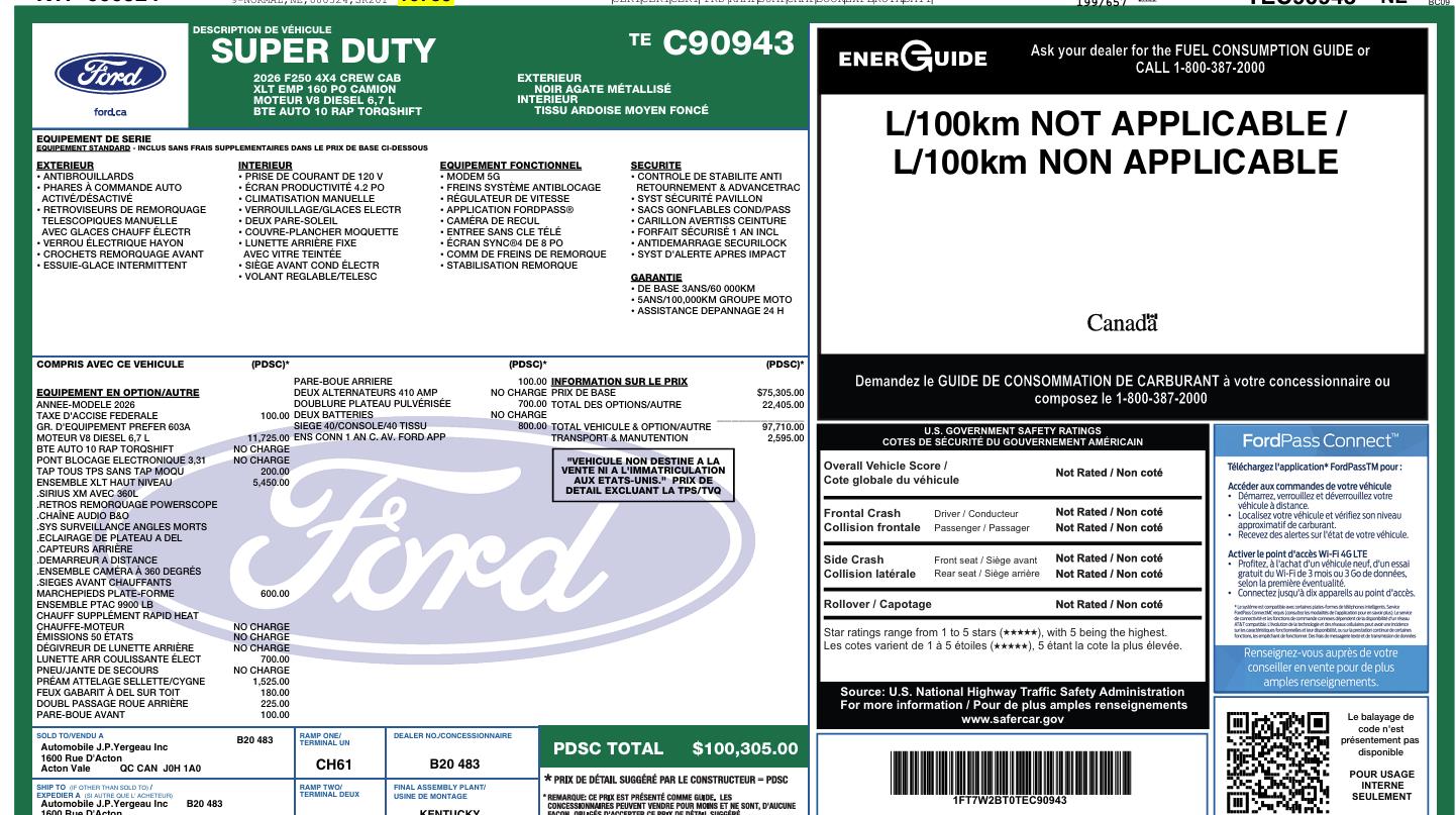 Détails du prix SUPER DUTY F-250 SRW XLT CABINE 6 PLACES 4RM CAISSE DE 8 PI 2026 #26215